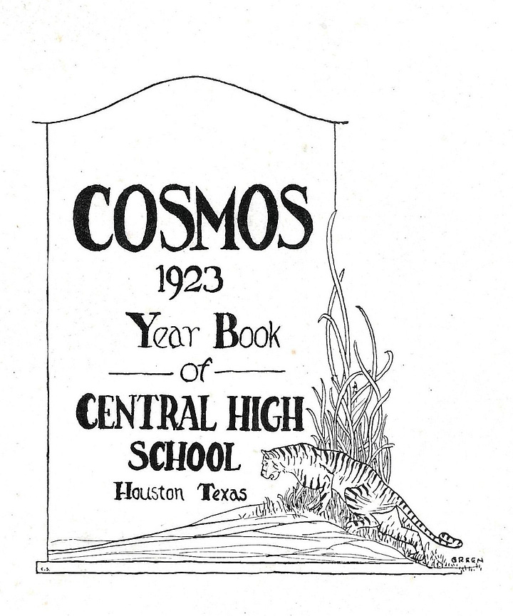 In December, I took a trip to one of Houston Public Library’s periodic book sales. I picked up a few books, including a 1923 high school yearbook from Central High School in Houston. I piled my book haul into the back seat of my car. Apparently the yearbook fell out of the paper bag holding the rest of the books I bought that day. Between that moment and a couple of days ago, that yearbook has sat on the floor of my car. I had forgotten I bought it. But yesterday I rediscovered my copy of Cosmos and finally took a look.