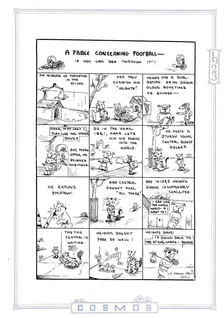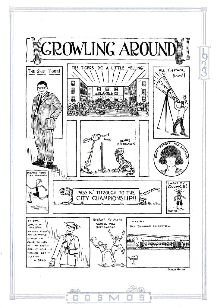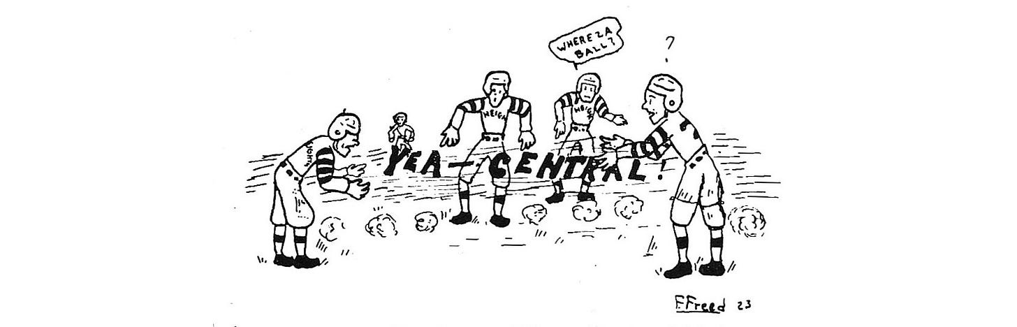 Freed was not an athlete at Central (at least his picture didn’t appear on any of the teams), but high school football was a big part of Central High life, and his cartoons reflect that. I suppose this is an accurate representation of the team’s jerseys, pants, and helmets, but can’t be sure. In all the football team photos in Cosmos, the players are dressed in shirts and ties. If Central’s team were the Tigers, the bands on their arms could be their stripes.