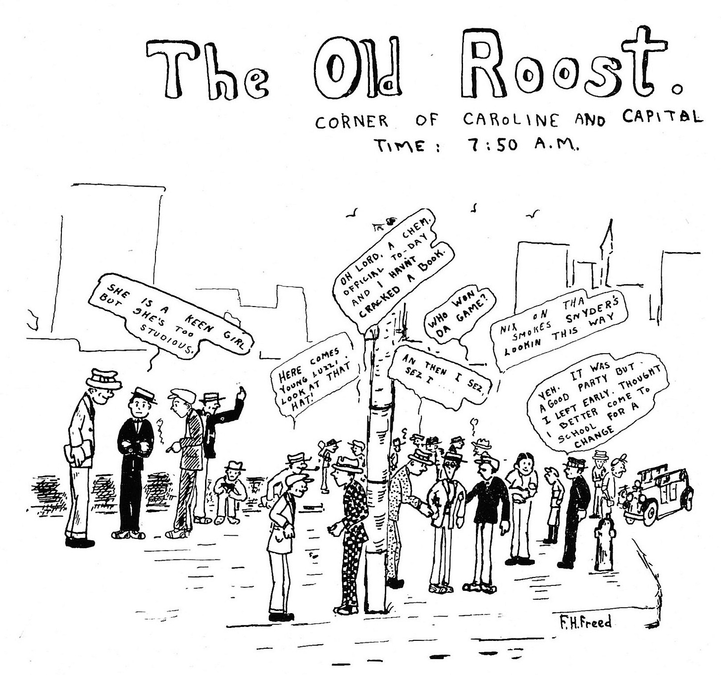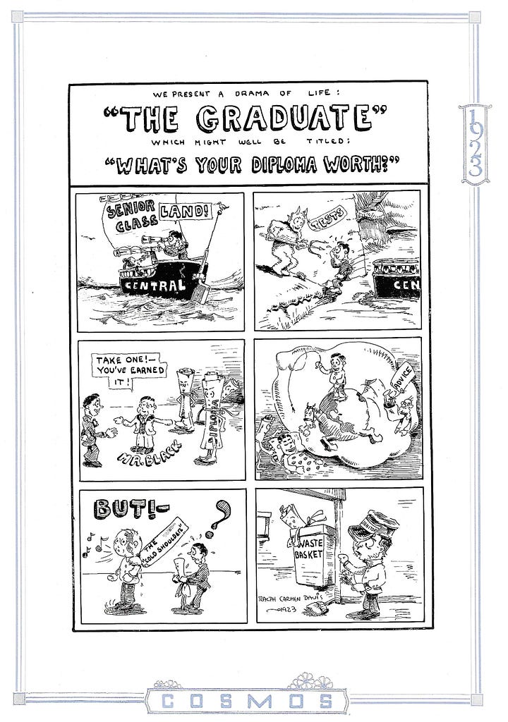 This is my favorite Freed cartoon in Cosmos depicts a gang of boys smoking in front of the school before classes. One boy warns the others about smoking because “Snyder’s lookin this way.” There was a senior girl at Central named Blanche Snyder—was this a dig at the class busy-body? Smoking if forbidden was not a hanging offense—otherwise Freed wouldn’t have felt free to draw his classmates with their cigarettes and pipes blazing for the yearbook.